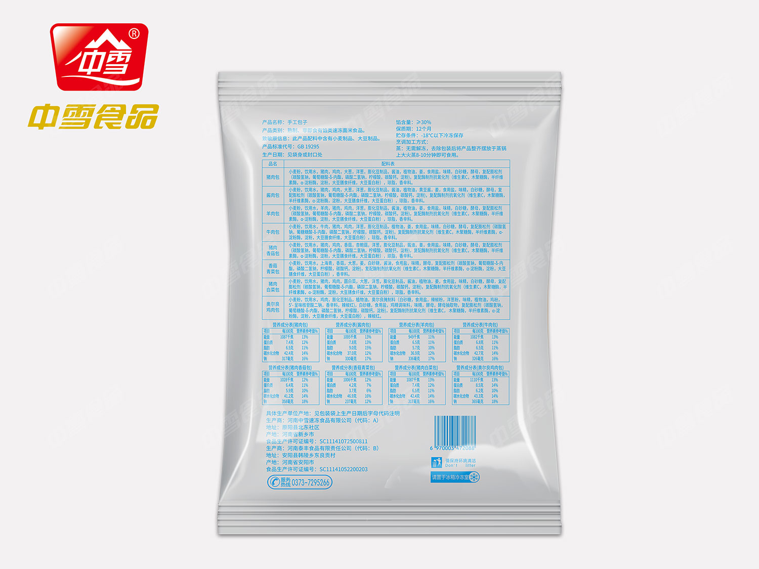 口味:豬肉、醬肉、羊肉、牛肉、豬肉香菇、香菇青菜、豬肉白菜、奧爾良雞肉